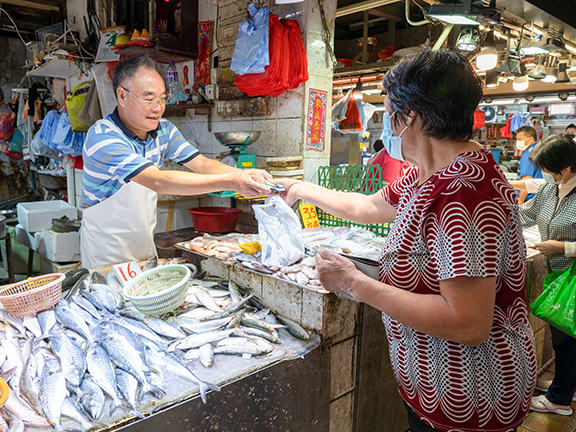 在秀茂坪街市经营近20年的刘舒畅,一直没有停步,更与时俱进。摊档今年初起安装了电子支付,刘舒畅说现在有时遇到街坊没有带足够现金来买海鲜,用手机一样可以给钱。同时由于自己处理海鲜所戴的手套难免沾有污水,电子支付减低了传播细菌的风险,令交易更加卫生,而这些改变也令业务持续发展下去。