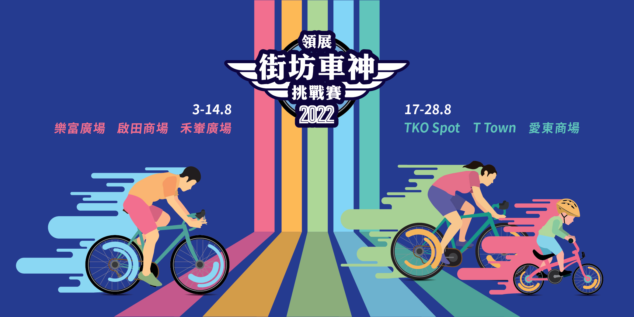 比赛于2022年8月3至28日期间分两轮进行,届时领展旗下位于香港、九龙及新界共六个商场会设有室内健身单车,号召各路隐世车神,落区大显身手!除了男、女车神组别,今年更首度增设小车神组及亲子组,欢迎一家大细总动员,争夺各组别“街坊车神”殊荣。实时排名会于比赛现场及活动网页实时发布,欢迎随时随地紧贴战况。