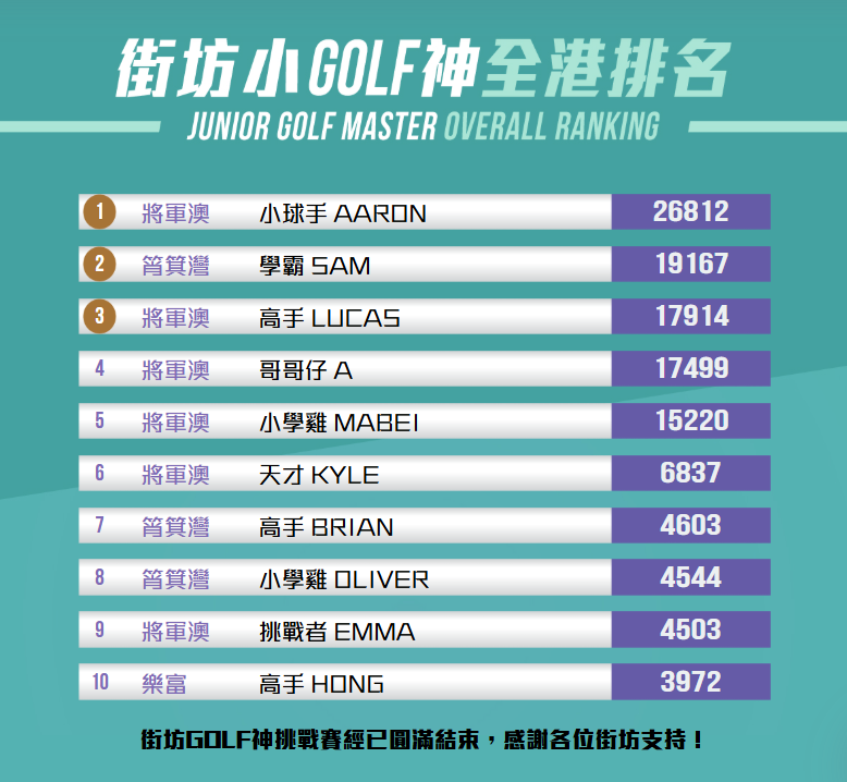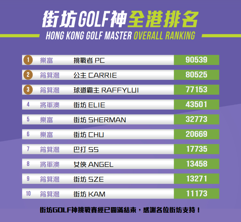 比赛分为“街坊Golf神组”及“街坊小Golf神组”两个组别。参赛次数及地区不限,参与次数越多,问鼎Golf神机会越高!