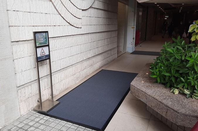 - 在出入口铺上地毯并以胶纸固定,避免地面湿滑