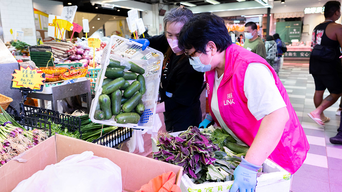 這天傍晚六時後,穿着粉紅色領展背心的珍姐純熟地推着手推車,在領展南昌薈街市逐一向有意送贈瓜菜和生果的店主,回收可食用但仍未賣出的食物。