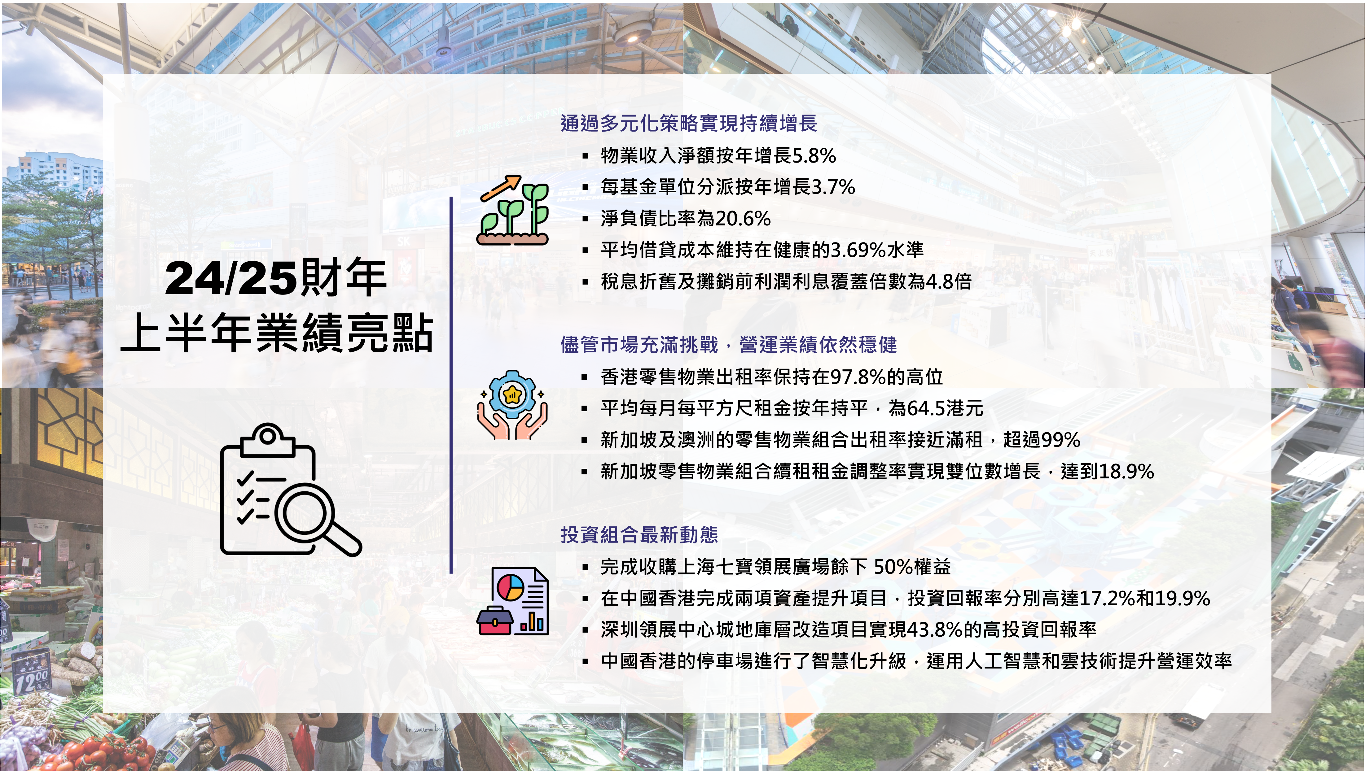 在11月6日,我們公佈了2024/25財年上半年的業績報告。在這充滿挑戰的市場環境中,領展房託依然展現了整體韌性與實力。